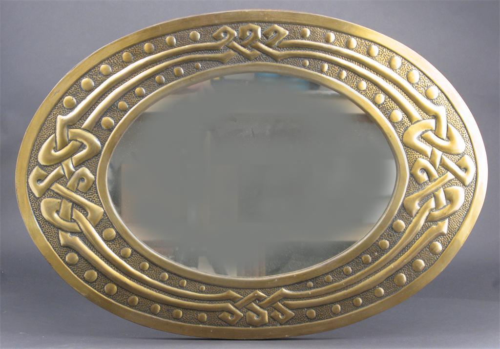 A Glasgow School brass mirror elliptical form, stamped in low relief with Celtic knot border unsigned 60cm. wide