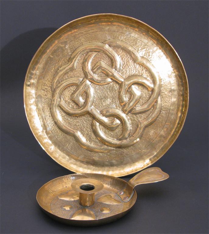 A brass circular card tray with stamped Celtic knot motif, and a brass chamberstick unsigned tray 28cm. diam.