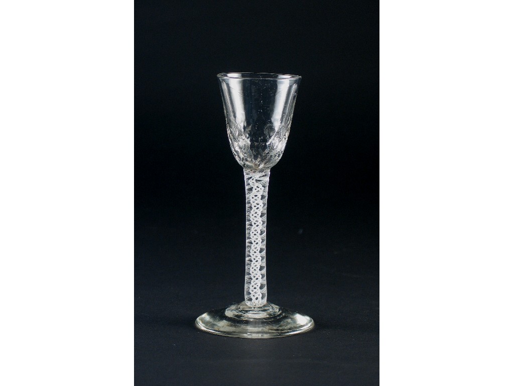 A wine glass, with a part-moulded bowl on a double series opaque twist stem, c.1760-70, 14.8cm.