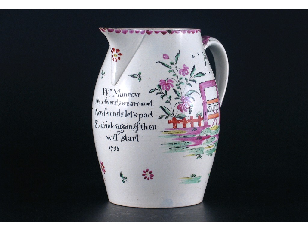 A dated creamware jug, inscribed 'Wm Munrow, Now friends we are met, Now friends let's part, So drink again & then well start, 1788 ', between flowers. Small rim chips. 17cm.