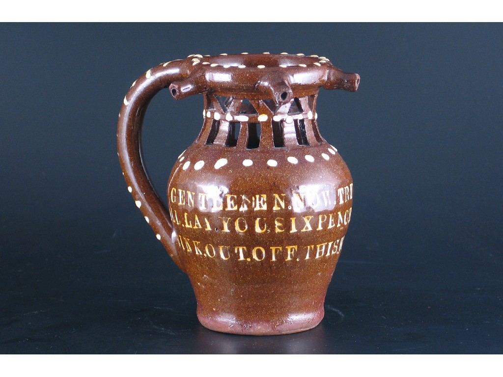 A slipware puzzle jug, the red body inlaid with a verse, the neck, handle and shoulder with trailed dots. Restoration to one spout. 19th century, 17.5cm.