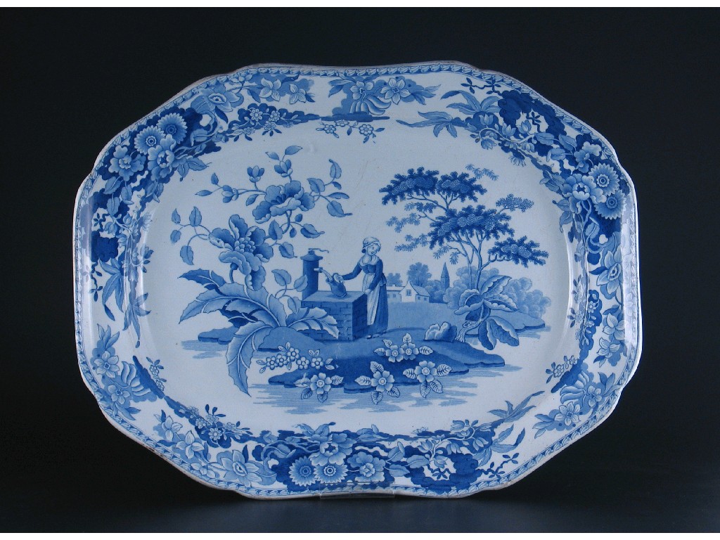 A large Spode blue and white meat plate, printed with a woman at a well, impressed and printed marks, c.1820, 50.5cm.