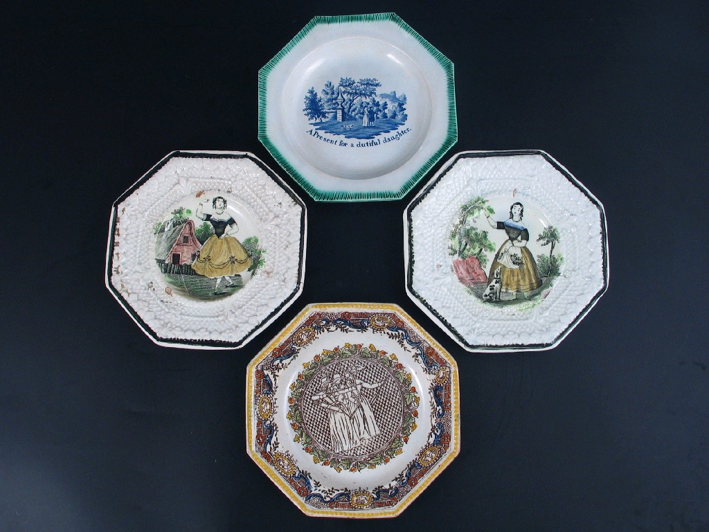 Four octagonal childs' plates, one inscribed 'A present for a dutiful daughter', one printed with archers and two with young girls, the latter with impressed marks, all 19th century, 15.5cm. (4)