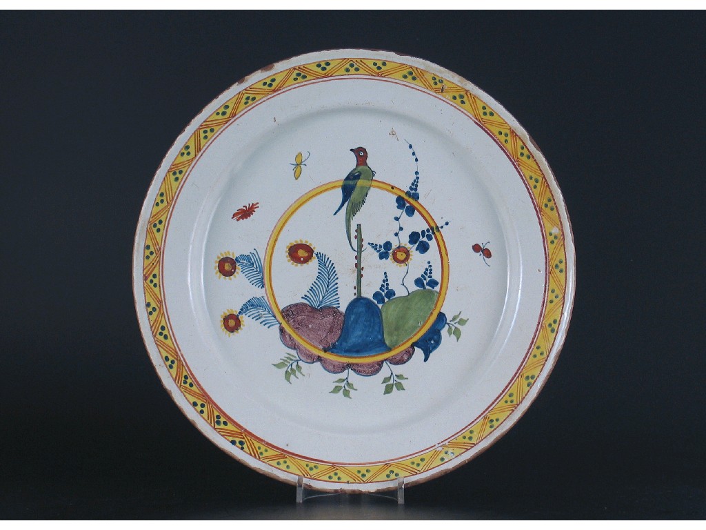 A Delft dish, painted in polychrome with a parrot on a yellow rim, with stylized rockwork, flowers, foliage and bugs. Small chips to the border. 18th century, 33cm.