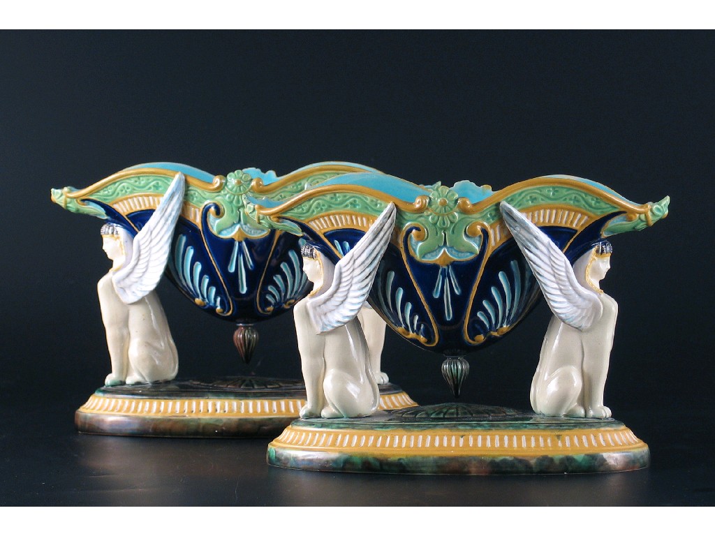 A pair of George Jones Majolica 'sphinx' jardini the bowls supported by winged sphinxes and...