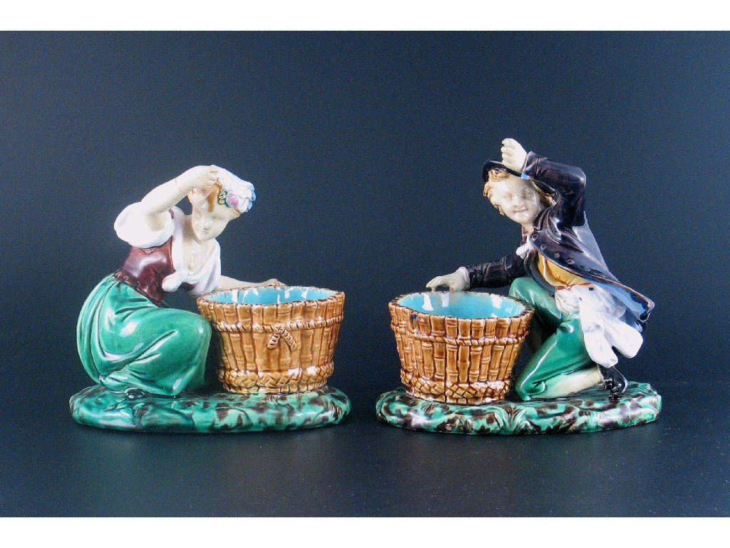 A pair of Minton Majolica sweetmeat figures, modelled as a young boy and girl kneeling beside a basket and raised on mottled bases, impressed marks and date codes for 1870. Both with damage. 19.5cm. (2)