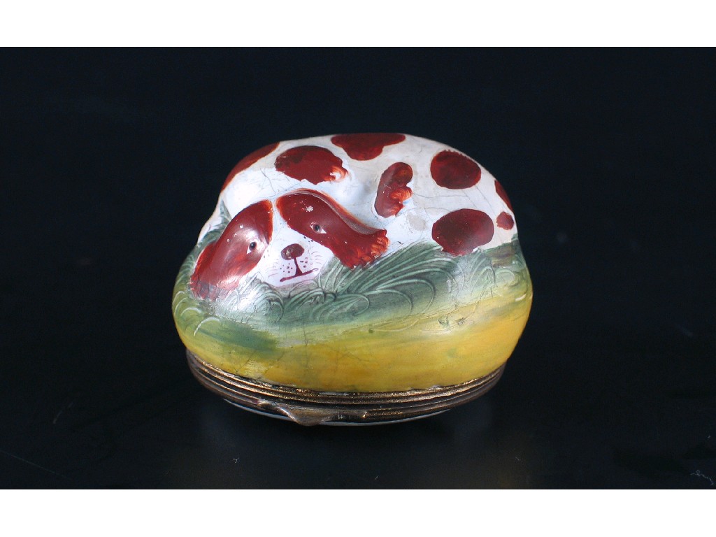 An enamel bonbonni modelled with a King Charles spaniel curled up amidst grass