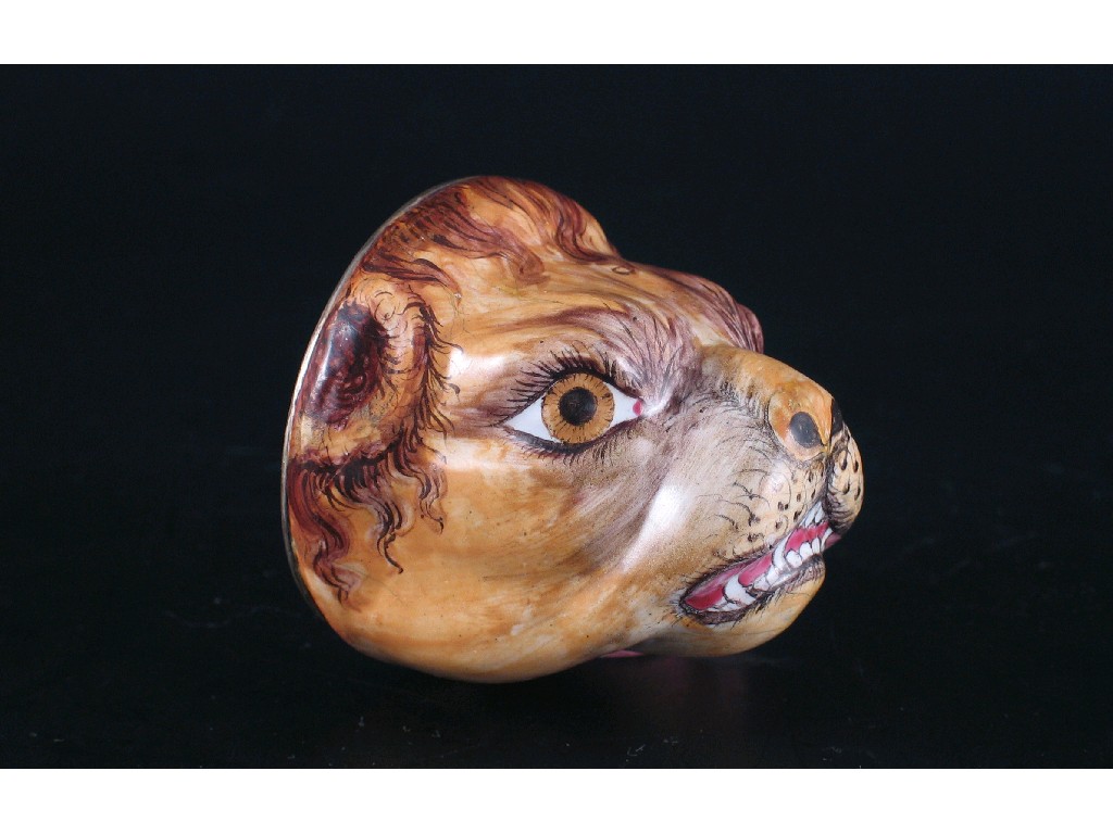 An enamel bonbonni formed as a lion's head, bearing its teeth. The cover lacking. Mid 18th century, 5.5cm.
