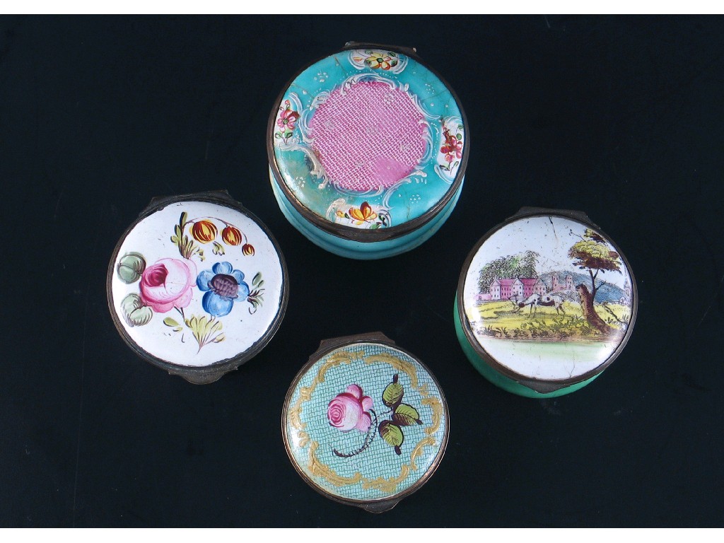 Four circular enamel boxes, variously decorated with flowers, scrolls and one with a deer before a country house. Some damage. All 18th century, 5cm. (4)
