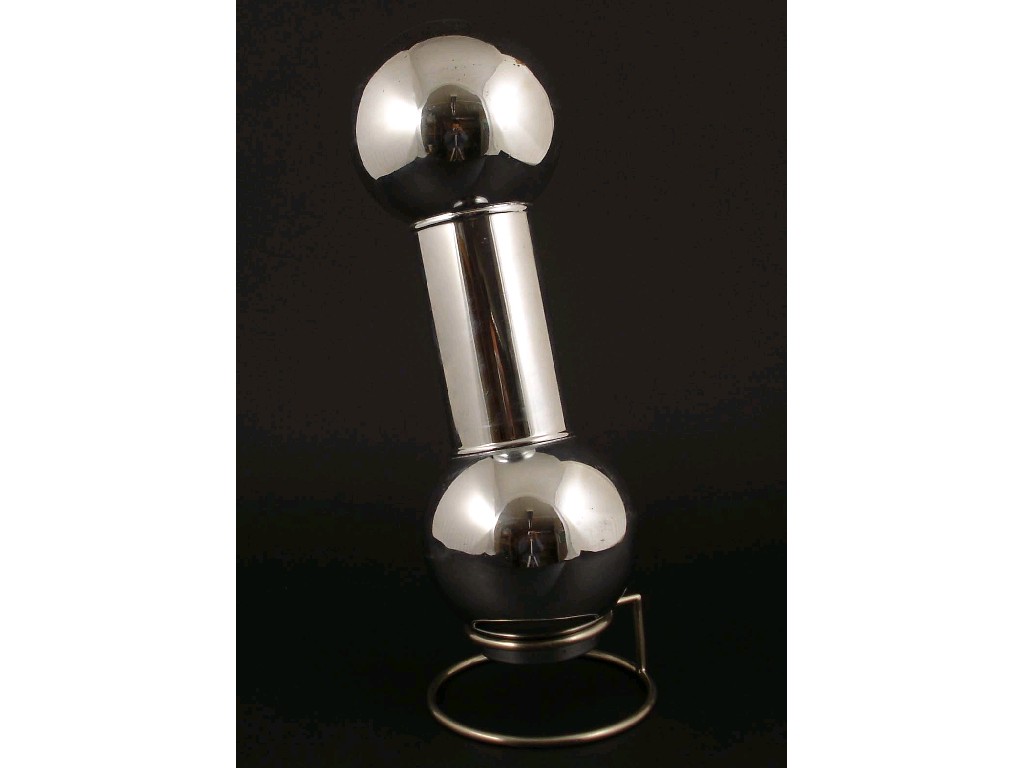 An electroplated novelty cocktail shaker modelled as a dumbbell, with wirework stand stamped patpen 32cm. high