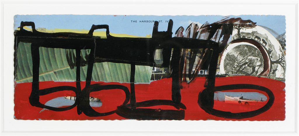 Oil on panoramic view postcard with collage