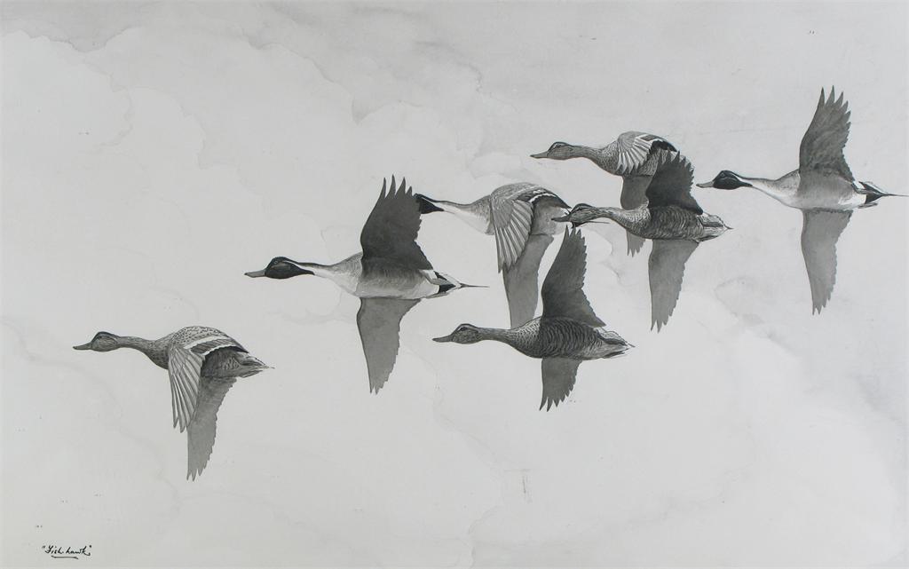 Charles de Feo 'Fish-hawk' (American 1892-1978) Pintail in flight Signed Fish-hawk Grisaille...