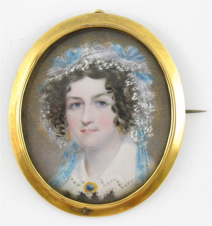 English School 19th Century Portrait of a lady wearing a blue and white lace bonnet Oval
