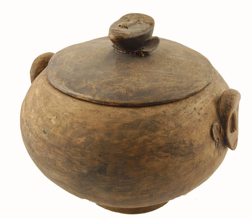 A South East Asian lidded bowl, of globular form, with mask lifts and finial, 14in (35.5cm) h, 16in (40.5cm) dia, lid with woodworm.