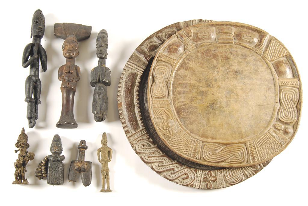 Two carved hardwood platters, with raised borders decorated faces and hands (Eshu), the largest 18in (45.5cm) dia, Yoruba, together with five wood carvings and two brass cast figures. (9)