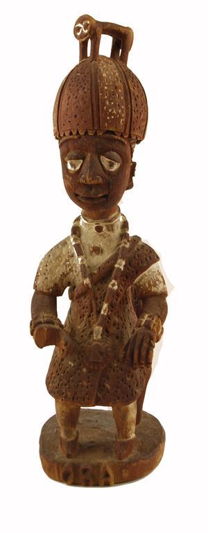 Thomas Onu, a carved wood seated figure of Oba, wearing a hat with an animal surmounted, the base relief carved 'OBA,' stained red and white, 12.25in (31cm) h. Losses to back of chair and right hand.