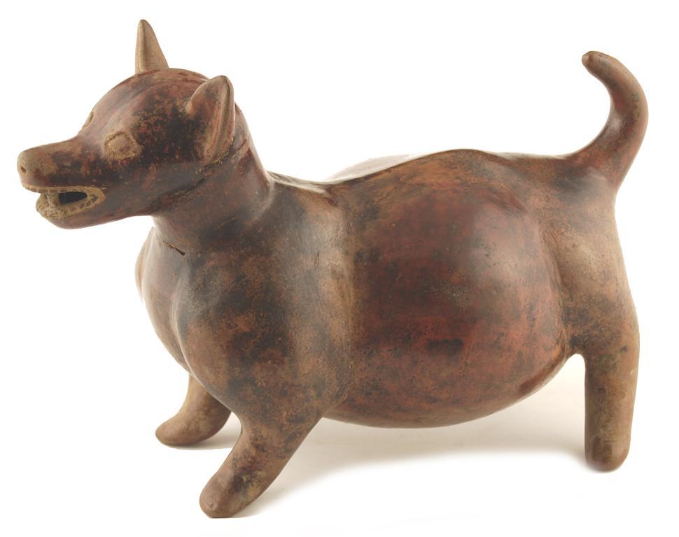 A pottery model of a standing dog, with a burnt red glaze, possibly Pre-Columbian, 10.5in (26.5cm) h. Repaired
