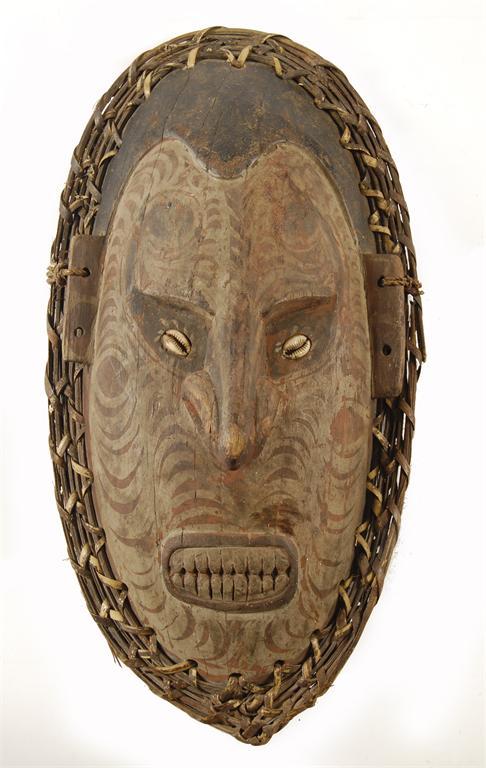 A Sepik River mask, with inset cowrie shell eyes and wicker outer framing, 17.25in (44cm) h.