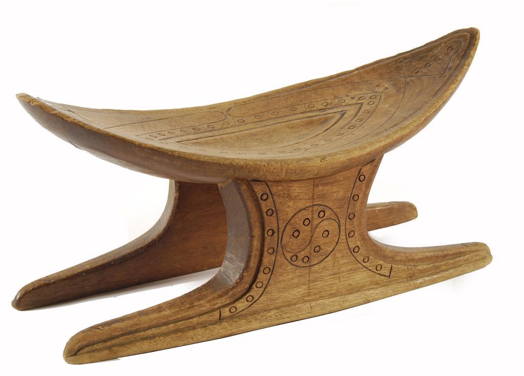 An Amazonian wood stool, the dished elliptical seat with incised and punch decoration on scroll supports, 9.5in (24cm) h, 20.25in (51.5cm) l.