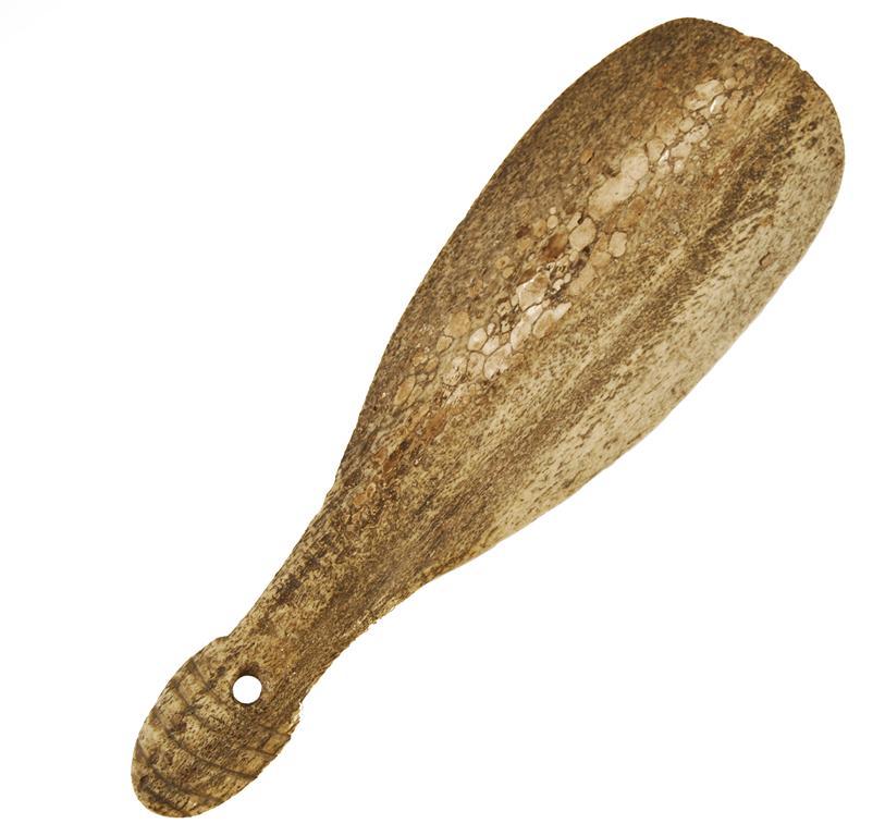 A Maori whalebone club, patu paraoa, of spatulate form with circular piercing to the neck and five curved grooves to the butt, 13in (33cm) l.