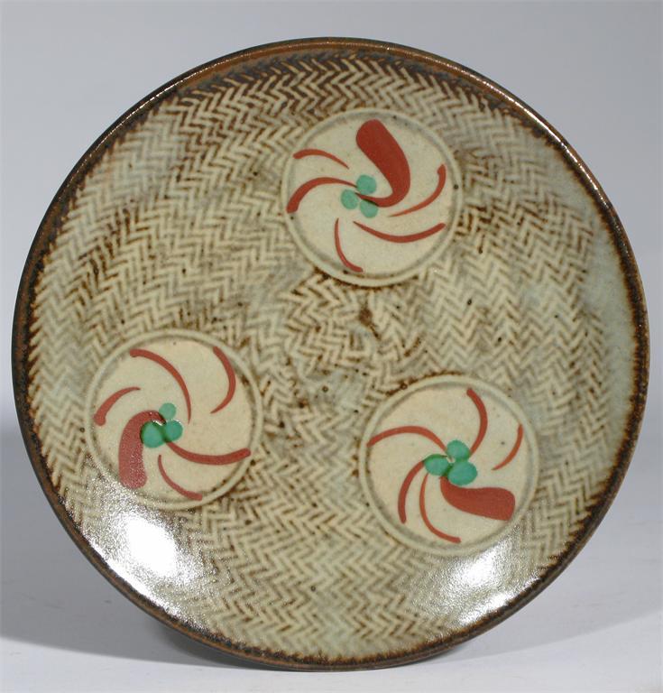 A stoneware dish by Tatsuzo Shimaoka painted with with three roundels, on a herringbone ground impressed seal mark 15.5cm. diam.