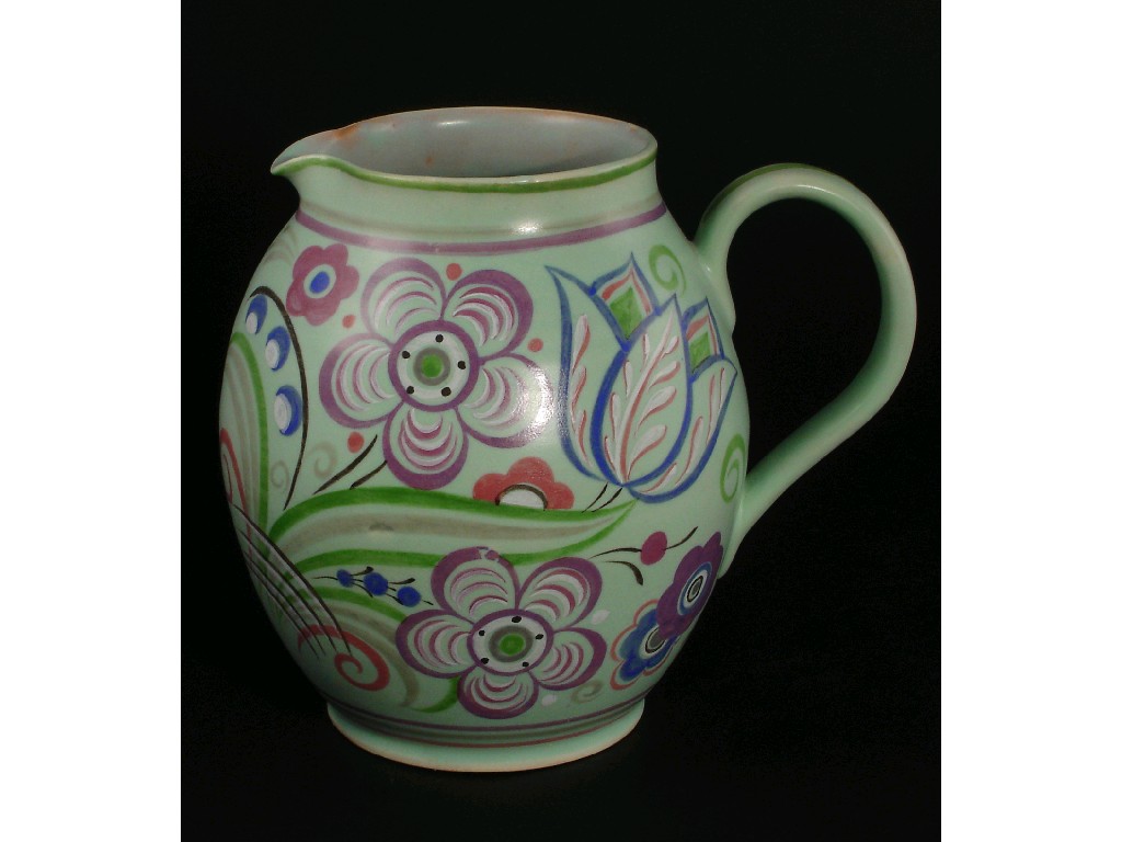An unusual Poole Pottery jug shape no 303, pattern DR, painted with flowers and foliage on a mint green ground impressed and painted marks, restored handle 19.5cm. high