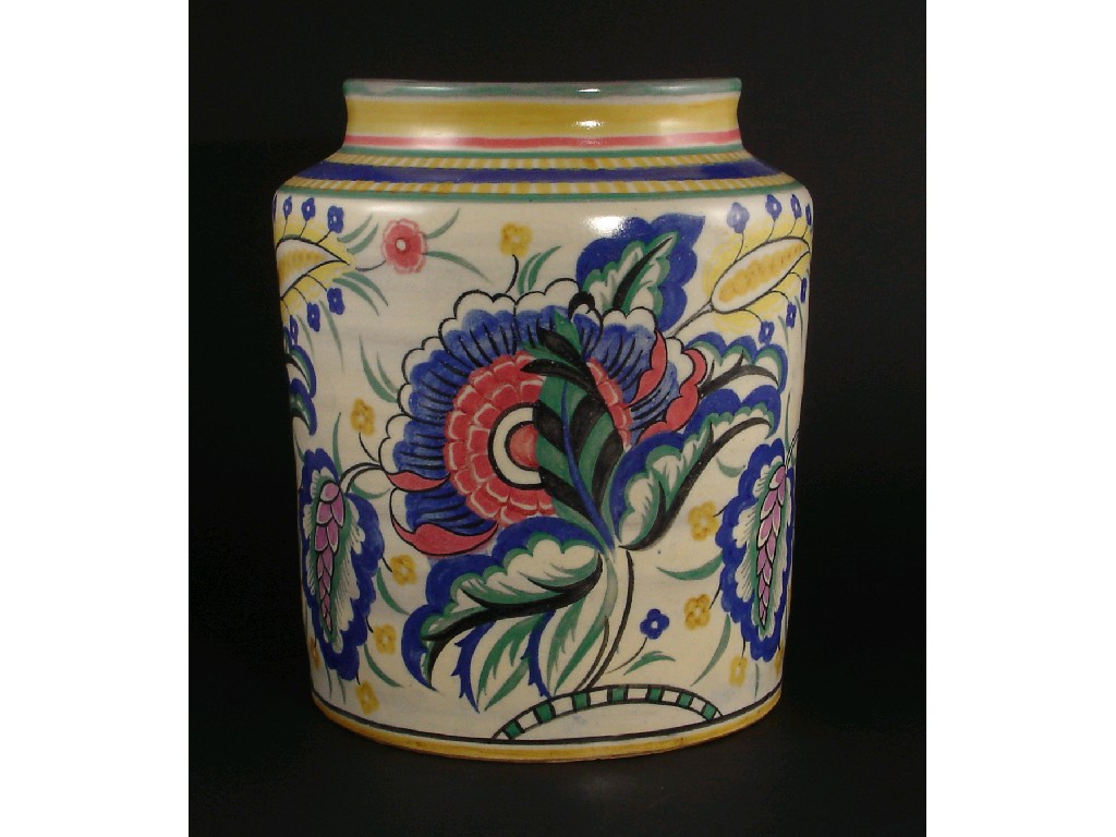 A Carter. Stabler & Adams Poole vase pattern YT, painted with stylised flowers on an off white ground impressed marks, painted marks, minor restoration to top rim 28cm. high