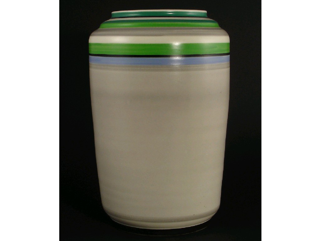 A Poole Pottery Everest vase, shape 660, cylinder form with stepped rim, the rim spray glazed with bands of grey, green and blue on a pale grey ground impressed mark, hairline to top rim. 31cm. high