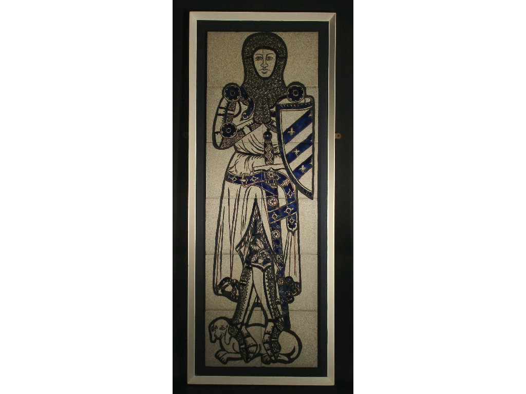 A Poole Pottery tile panel by Tony Morris, painted with 'Sir William Fitzralph', framed paper authentification to reverse 101cm. high