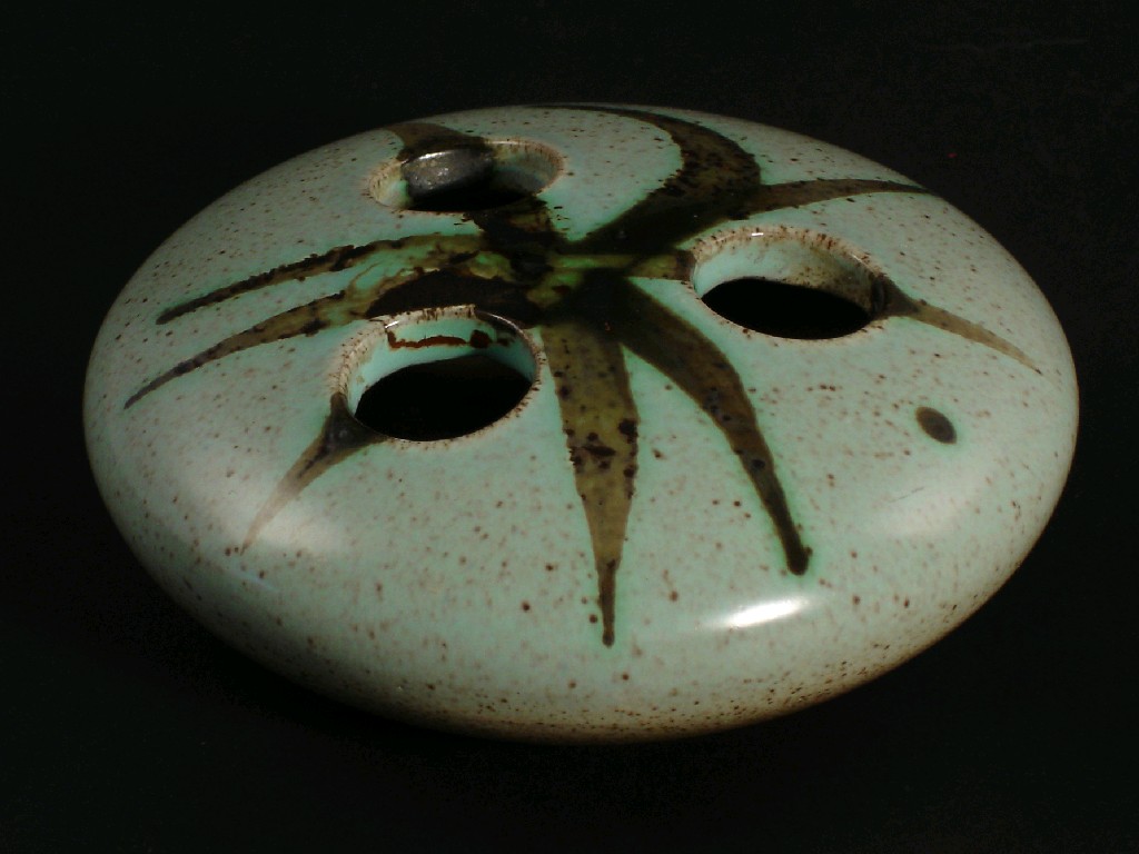 A Poole Pottery Atlantis 'Pebble' vase model A52, with three apertures painted with foliate design impressed marks, incised JH monogram 12cm. diam.