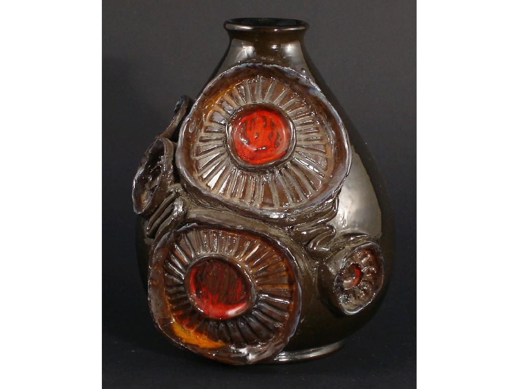 A Poole Pottery Studio Craft vase probably by Tony Morris, crudely applied with sucker roundels, with glazed red medallions, on a thick brown ground impressed mark 20cm. high
