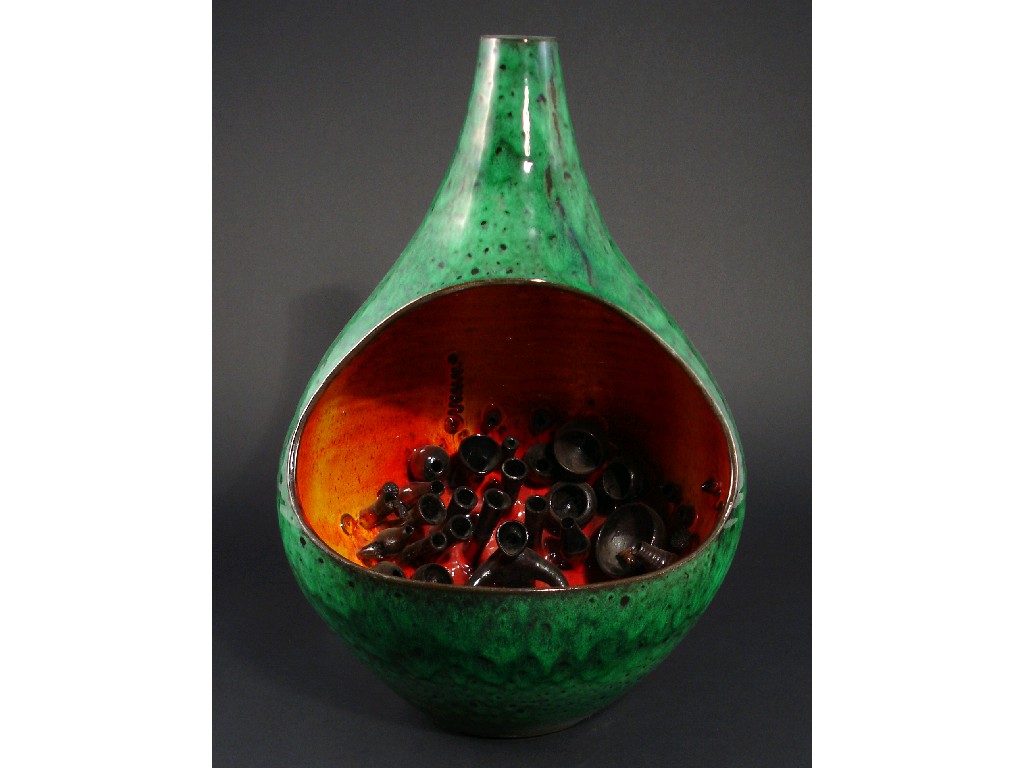 A rare Poole Pottery Atlantis 'Mermaid' lamp base by Guy Sydenham, ovoid form, internally modelled with a mermaid resting inside a cave of 'Poole' vases, glazed vivid orange to the interior, the exterior mottled green impressed Poole England, artist cypher 41cm. high