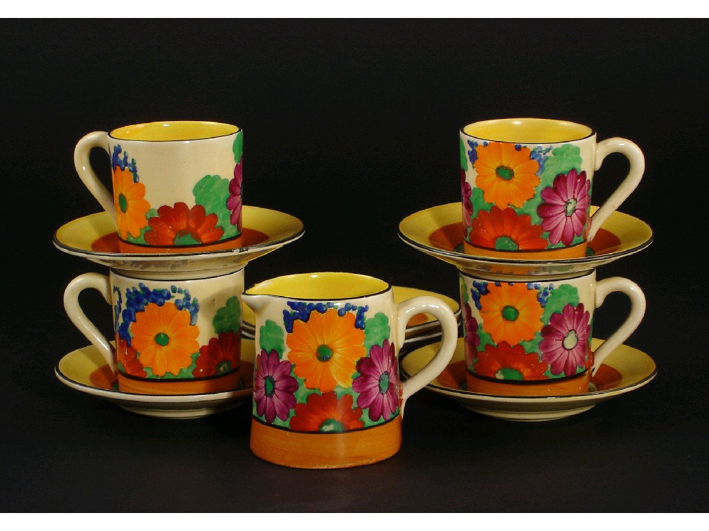 'Gay Day' a Clarice Cliff Bizarre part coffee service, comprising; milk-jug, four cans and six saucers printed and painted marks, hairline to one can 6.5cm. high