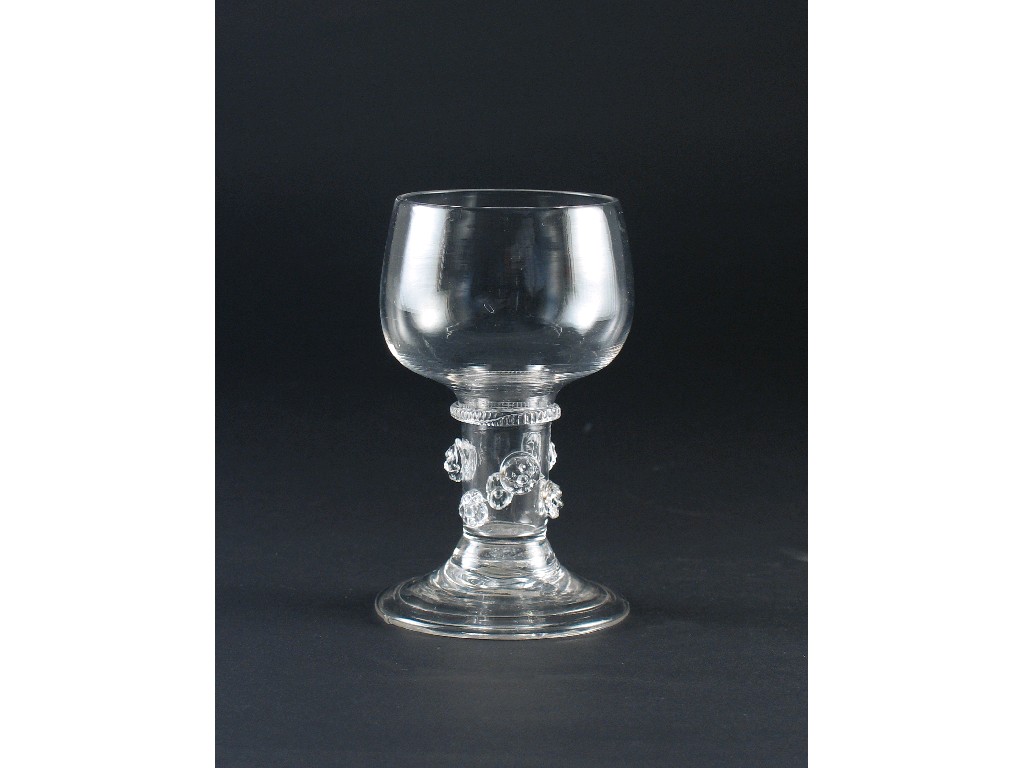 A r with a rounded bowl above a cylindrical stem applied with six prunts beneath an engrailed...