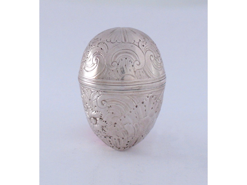 A George III egg, chased all over with flowers, scrolls and shells, unscrewing inhalf to reveal a steel grater, maker's mark only, by Samuel Meriton II, London, c.1775, 1.75in (4.5cm).