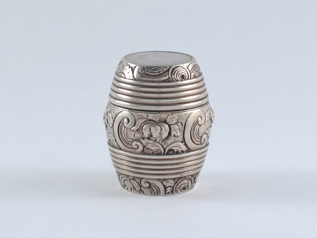 A George III barrel, decorated with alternating bands of reeding and chased floral scrolls, unscrewing to reveal a mounted steel grater, maker's mark only [struck twice], by Daniel Field, London, c.1760, 1.4in (3.5cm).