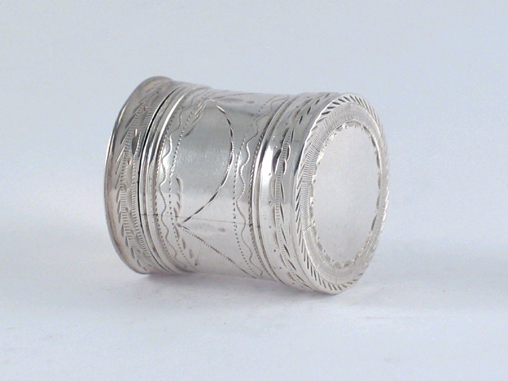 A George III small cylindrical grater, with bright engraved decoration and a pull-off cover and base, by Samuel Pemberton, Birmingham, 1792, 1in (2.6cm) high.