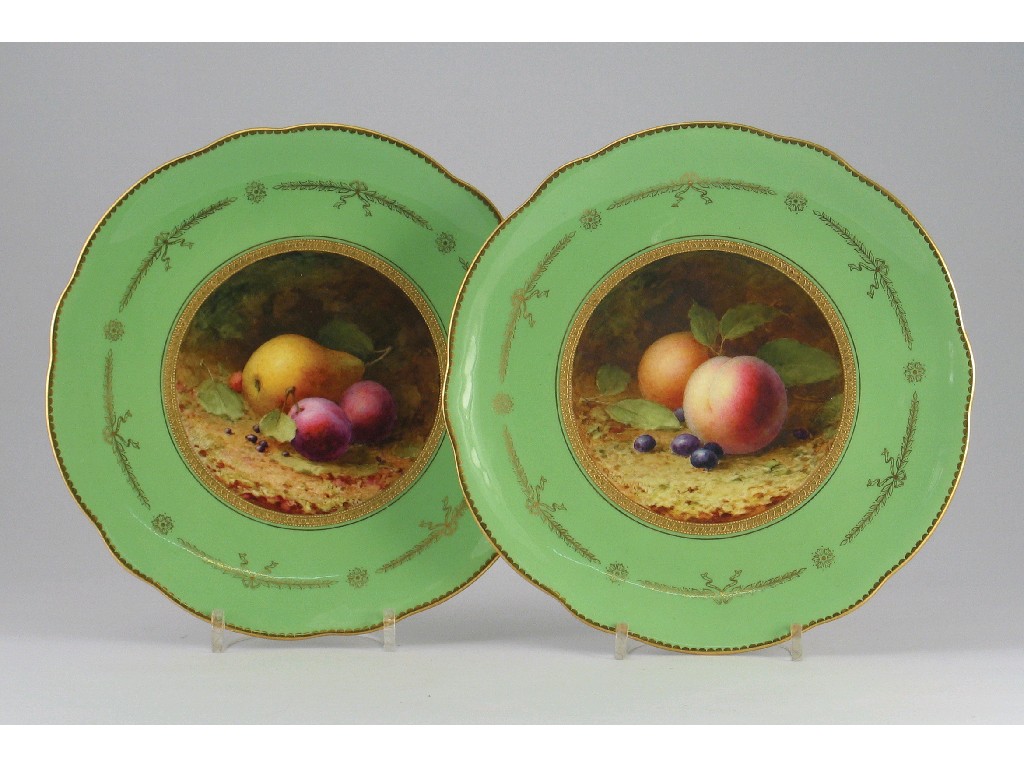 A pair of Coalport plates, painted with fruit, signed 'Chivers', within green and gilt borders, c.1915, 23cm. (2)