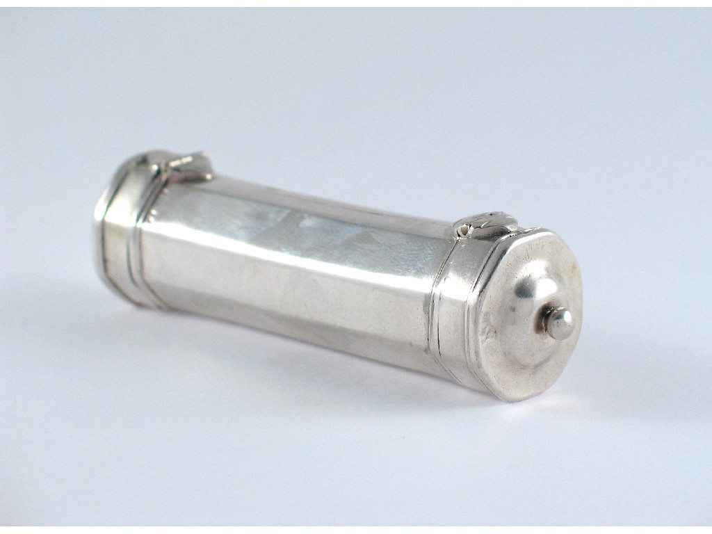 A William and Mary octagonal grater of tubular form, with a hinged base and a hinged cover with a ball finial and a tubular grater with suspensory ring, struck twice (once on grater and once inside) with an indistinct maker's mark IH?, unascribed, London, c.1690, 3.65in (9.2cm).