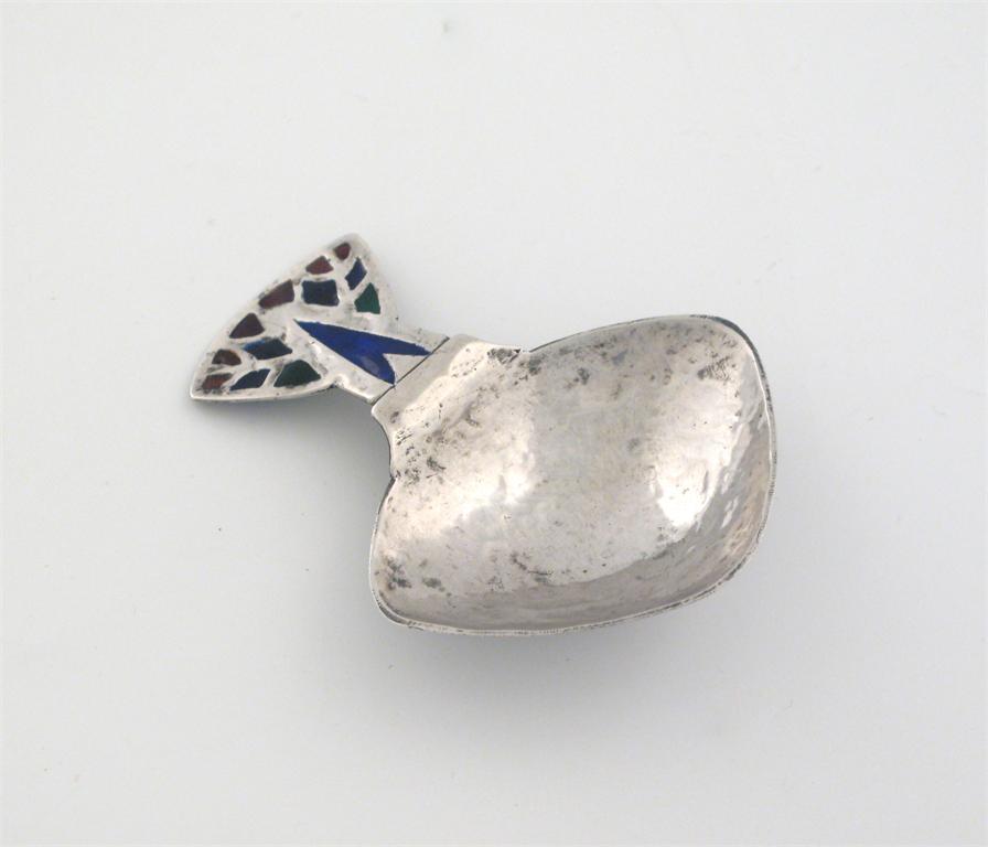 A modern caddy spoon, with a hammered triform bowl and a shaped plique a jour, decorated stem, makers mark of S. M Challoner*, London 1927, 0.5oz. *For Mollie Challoner of Newcastle Upon Tyne, 1923.