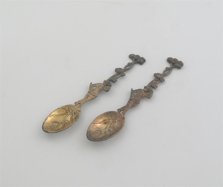 A pair of George II/III cast silvergilt teaspoons, the stems in the form of a harlequin below a tree, unmarked, 1760-70, 1oz. (2)