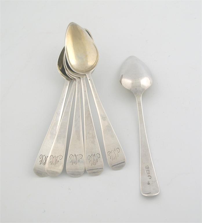 A set of six George III Provincial teaspoons, Old English pattern, initialled, by Thomas Watson, Newcastle c.1795 (no date letter), 2.25oz (6).