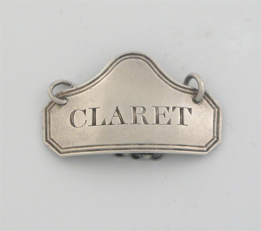 A George III wine label, of shaped octagonal form, reeded borders, incised 'CLARET', by Thomas Wallis II, London, 1809.