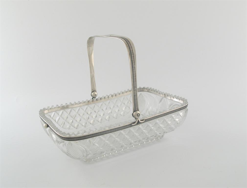 An early 19th century Dutch mounted, cut glass fruit basket with a ribbed, swing handle, makers mark 'N F', town mark distorted, 1832, 10in (25.4cm) long.