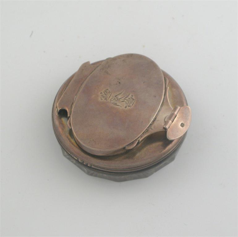**A William IV mounted cut glass shallow circular powder pot, with a starcut base and faceted body, the hinged screw down cover, crested below a Barons coronet, and inscribed inside '17th June 1833', by Archibald Douglas, London 1833, 2.6in (6.6in) diameter.