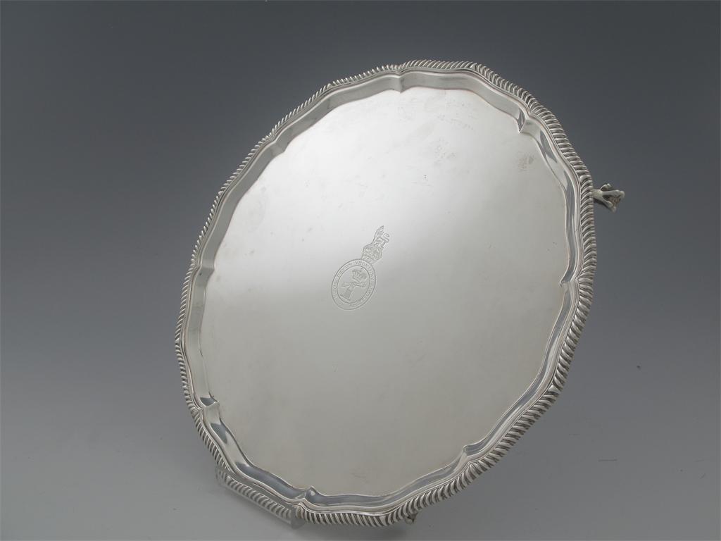 Regimental interest: A modern salver of shaped circular outline, with a gadrooned border and ball and claw feet, engraved centrally with the badge of the 'Royal Devon Yeomanry Artillery', the reverse with inscription and numerous facsimile signatures, by T. Bradbury & Sons, Sheffield 1925, 12in (30.5cm) diameter , 31oz