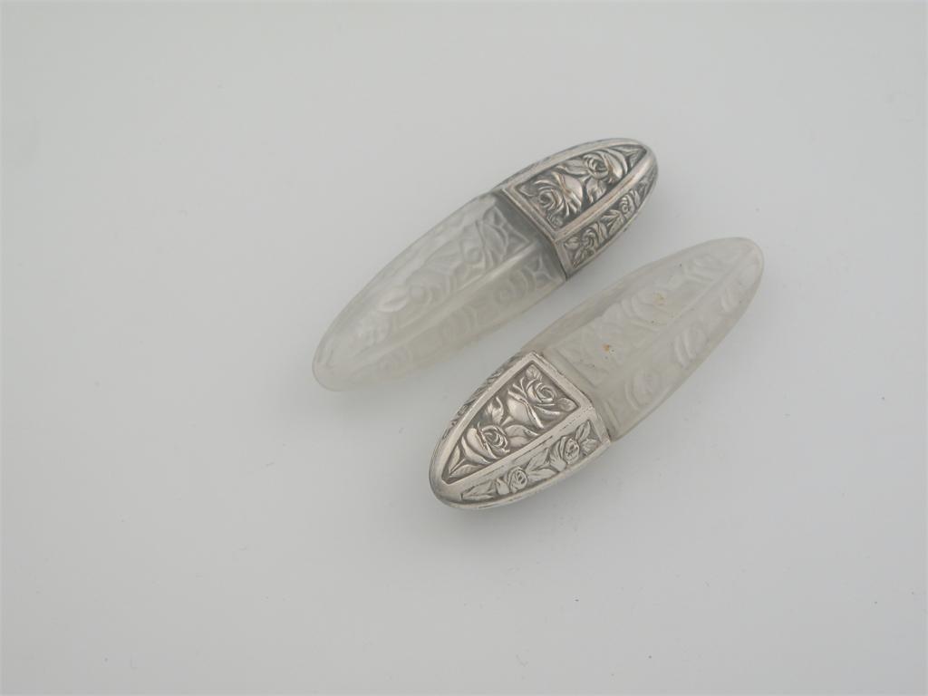 Two modern plated mounted opaque glass scent bottles, with moulded floral decoration, 2.75in (7cm) long. (2)
