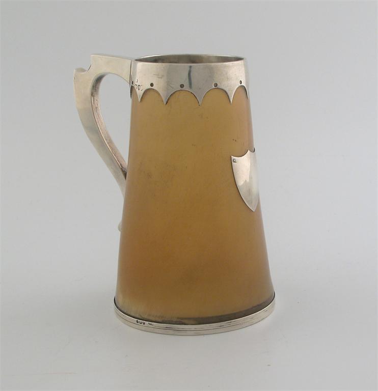 A late Victorian mounted horn mug, with an angular handle, by F. Brasted, London 1877, 5.9in (15cm) high