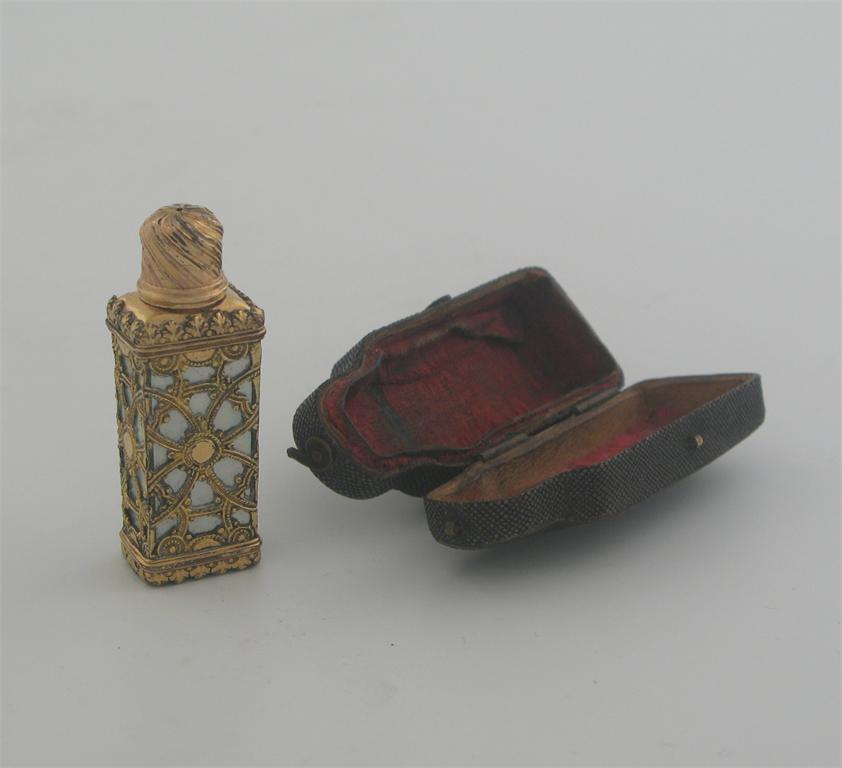 A George III gilt-metal mounted, mother of pearl scent bottle, with an oblong body, wrythen screw cover and original fitted case, c.1765, 2in (5.1cm) high.