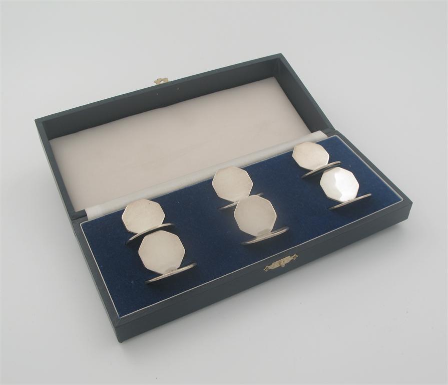A modern cased set of six menu card holders, with round bases and octagonal clips, Birmingham 1998, 3oz.
